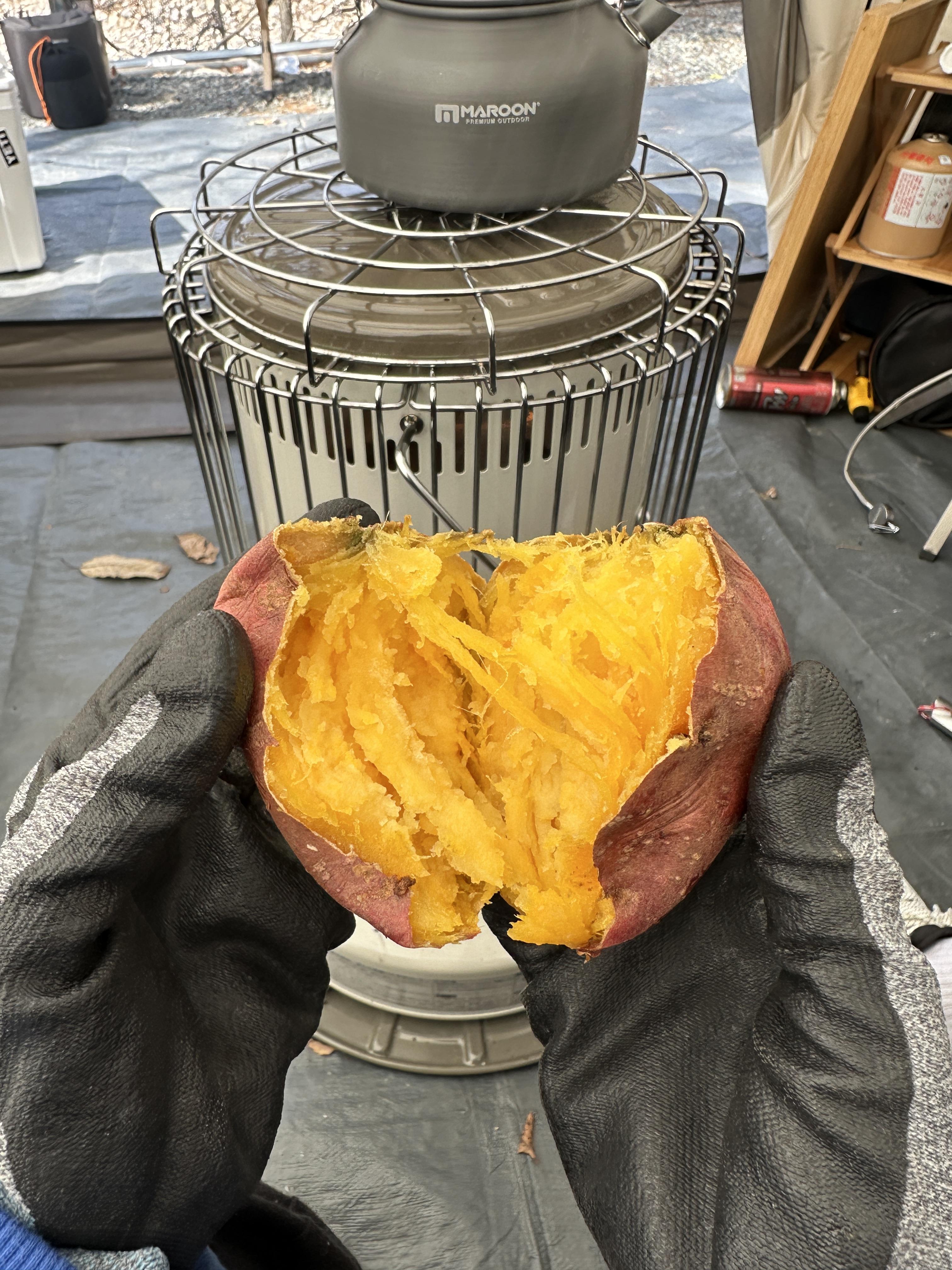 보이세요 고구마 잘익은거? 저랑 캠핑 가면 숯불 없이도 난로에서 고구마 저렇게 구워드립니다.